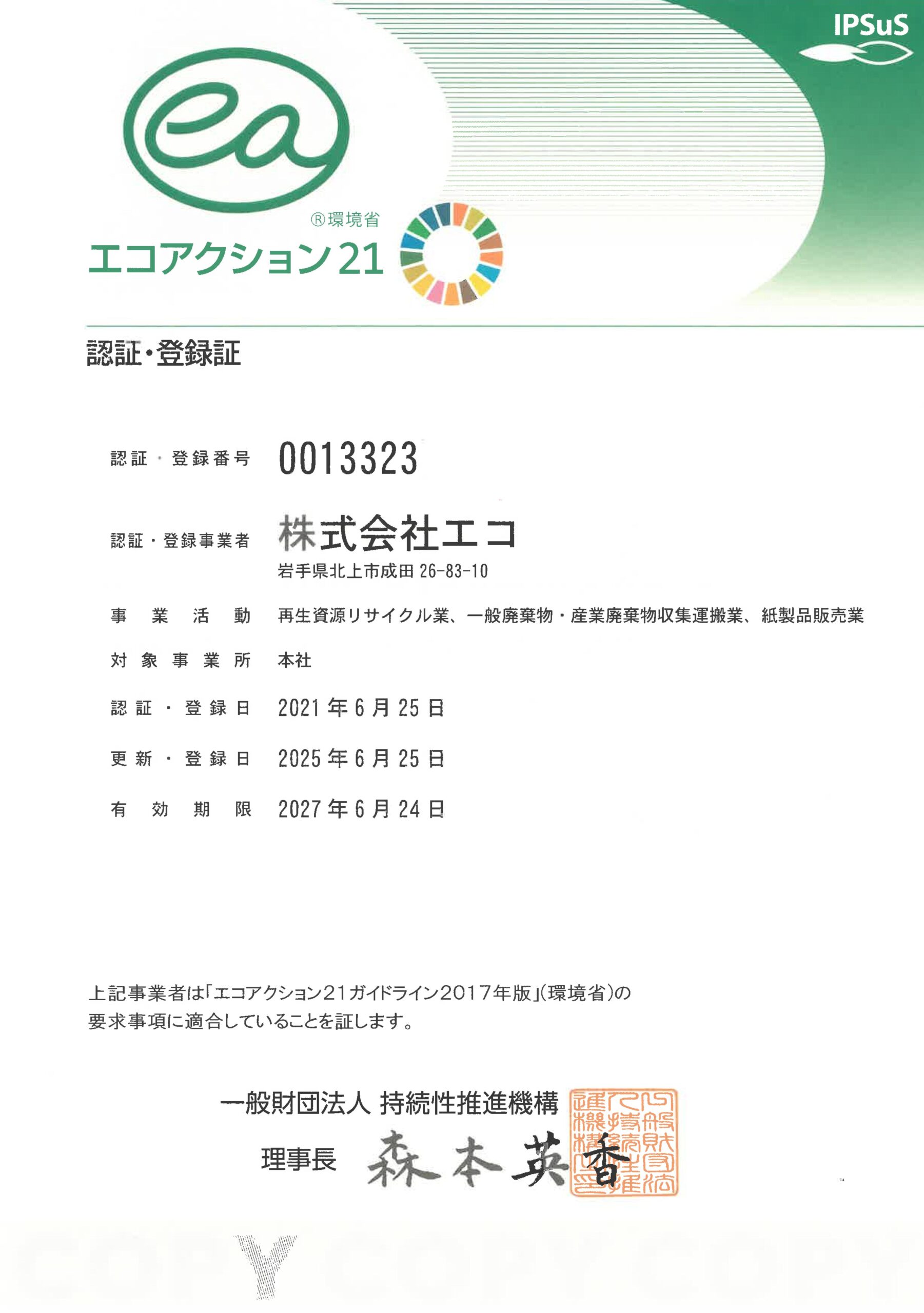 | 登録番号 | 一般財団法人 持続性推進機構 認証番号0013323 日本情報経済社会推進協会 第23510003(01) 古物商許可 211050000657 一般廃棄物収集運搬業 第554号 一般廃棄物処分業 第555号 産業廃棄物収集運搬業 許可番号00312047626 産業廃棄物処分業 許可番号00322047626 |